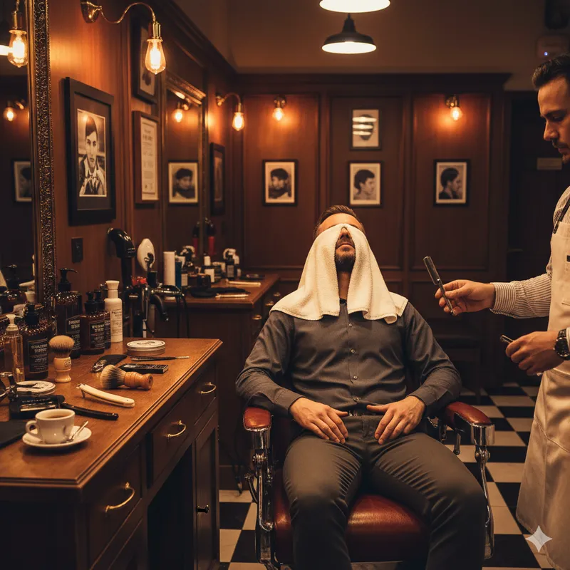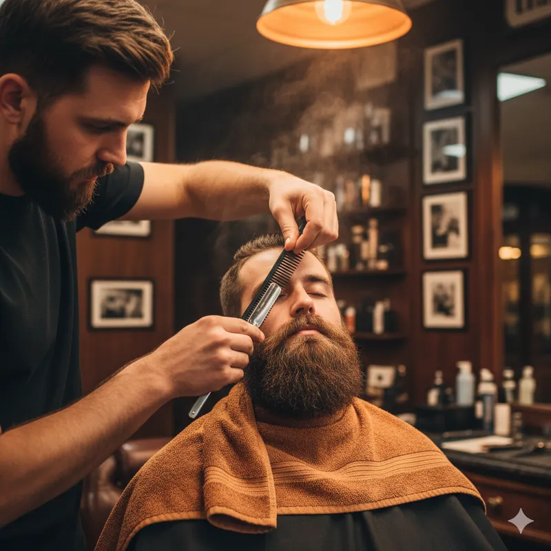 Modelação de barba especializada, contorno e barbear com toalha quente. Linhas perfeitas e acabamentos impecáveis com produtos premium.